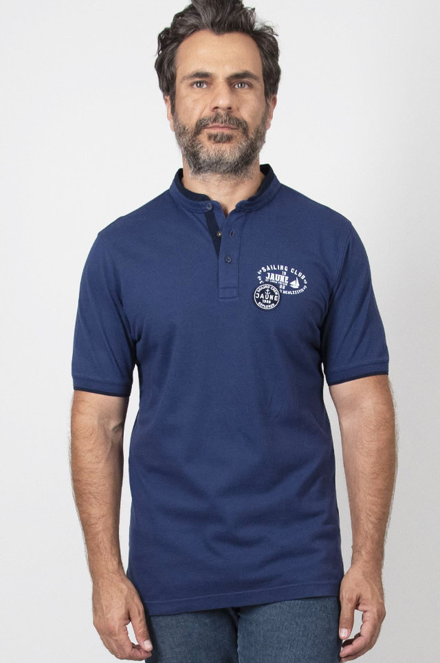 Custom fit short-sleeved double piqué polo shirt with button mao collar and artwork on chest.