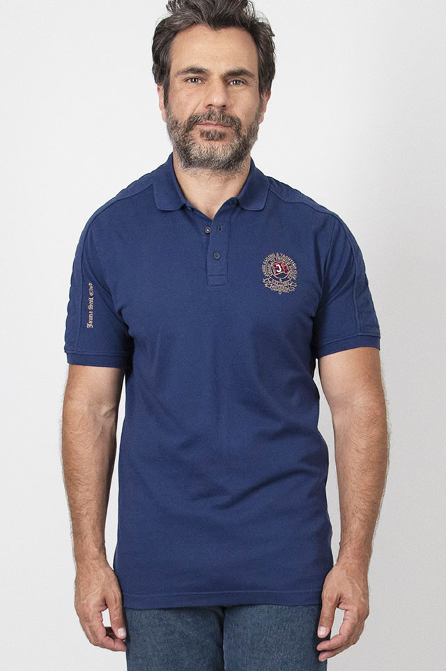Short Sleeve Indigo Polo With Quilted Shoulders