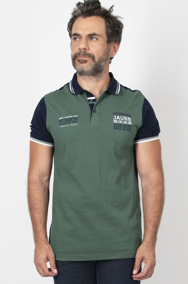 Custom fit short-sleeved double piqué blocked polo shirt tablier style and embroided artwork on chest.